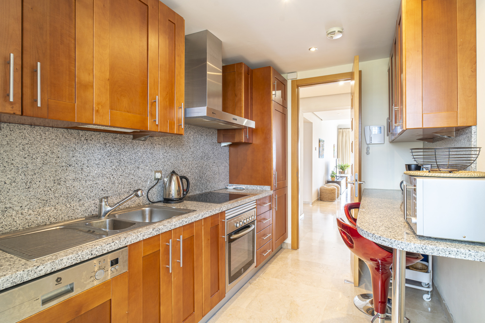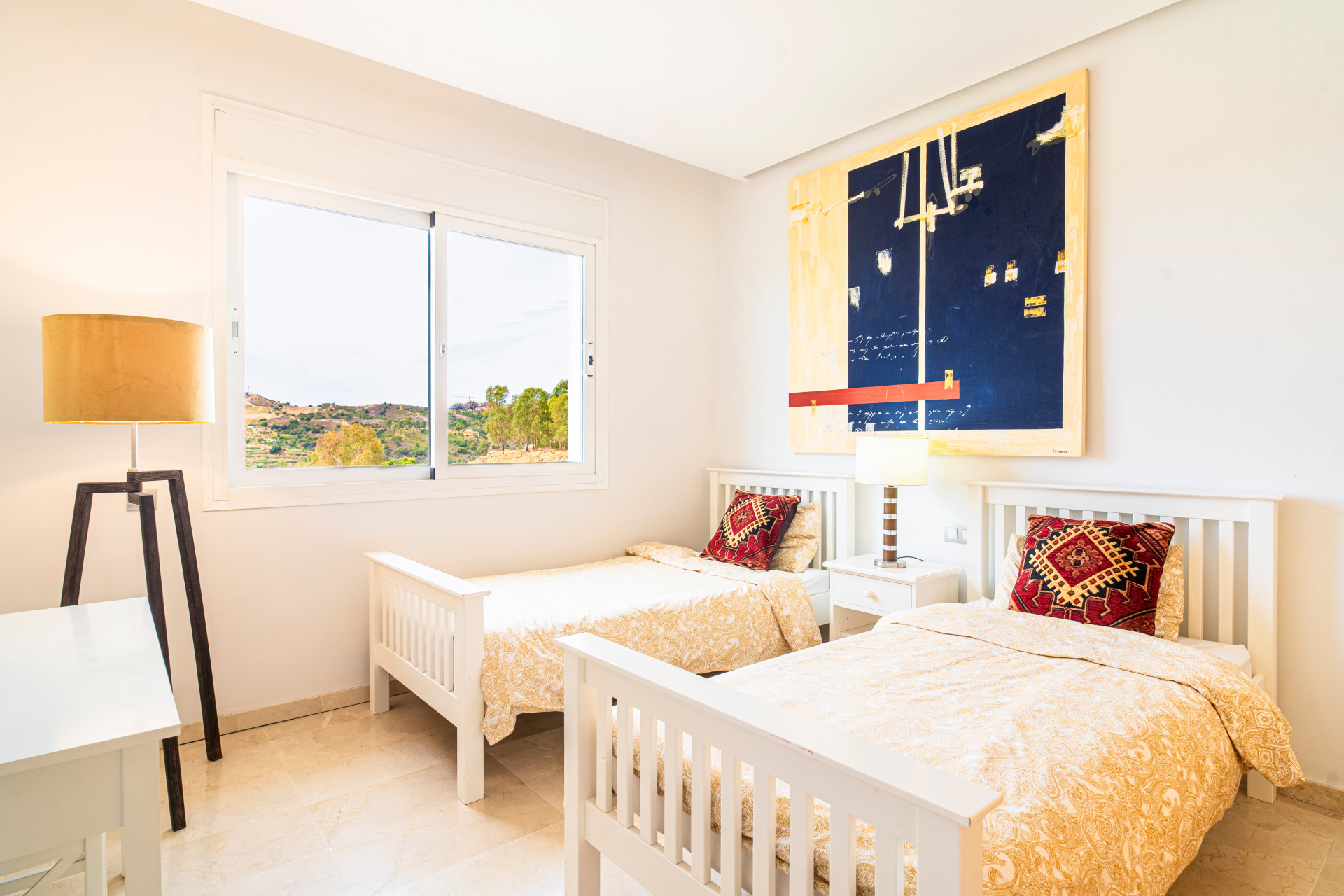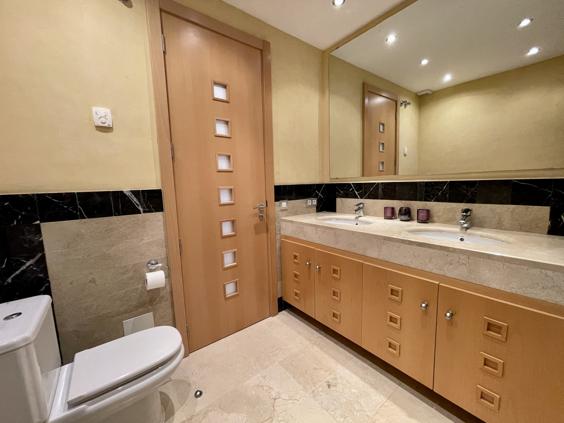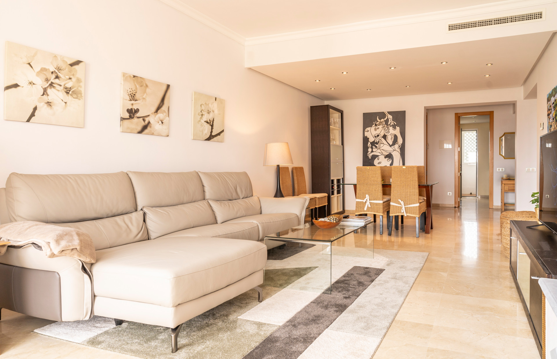 La propiedad incluye suelos de mármol crema en toda la vivienda, persianas eléctricas en el salón y dos de los dormitorios, bañera de hidromasaje y calefacción por suelo radiante en el baño principal, y aire acondicionado frío/calor.