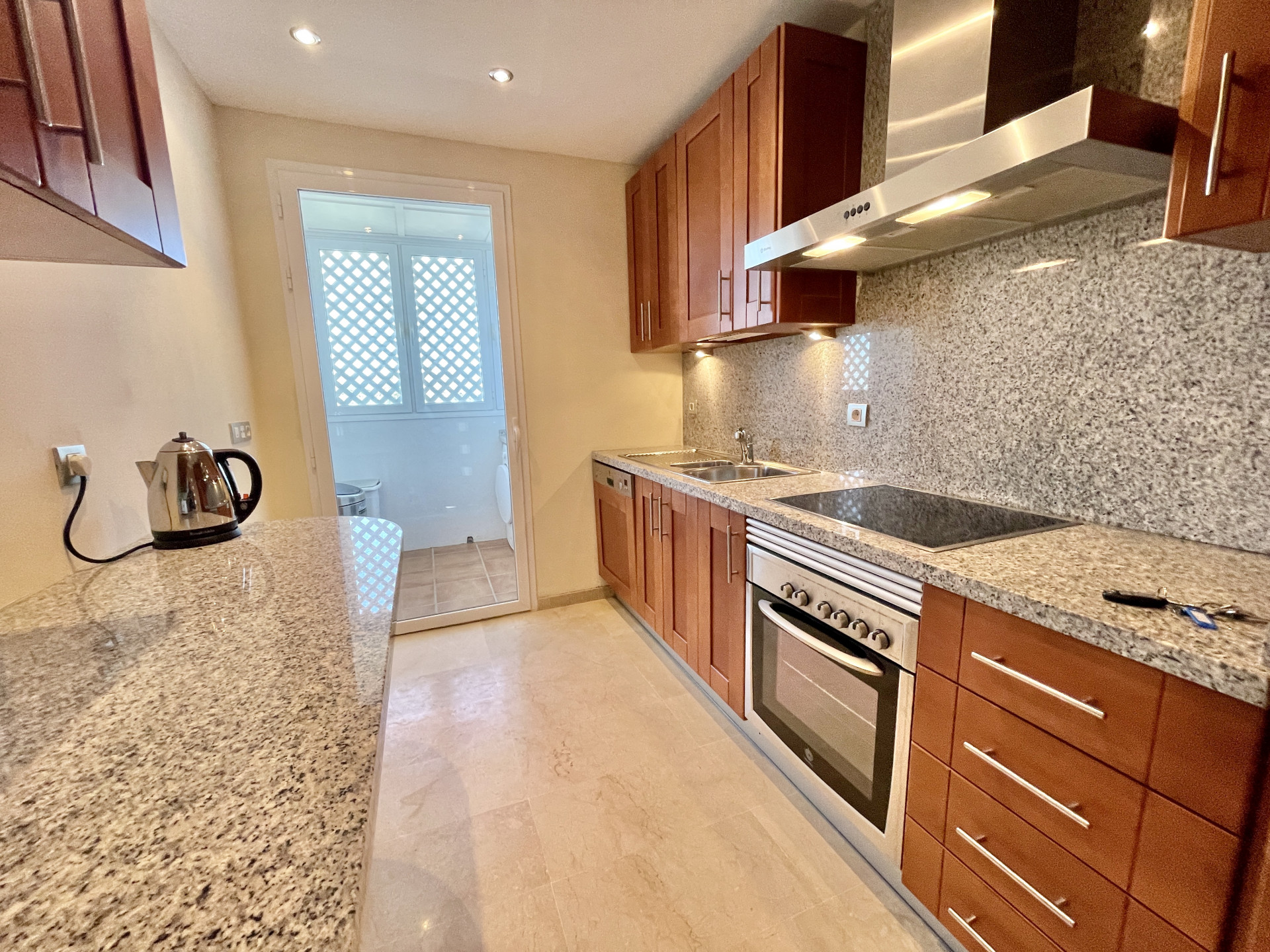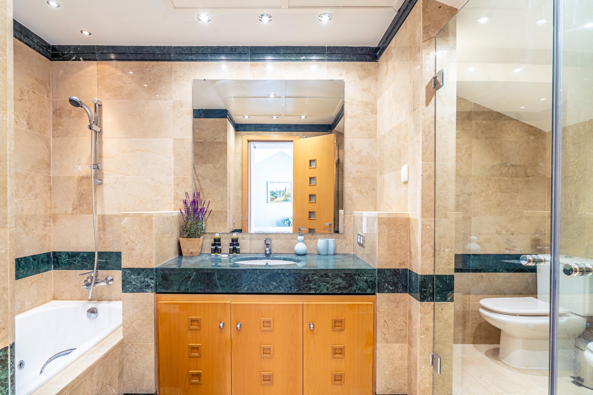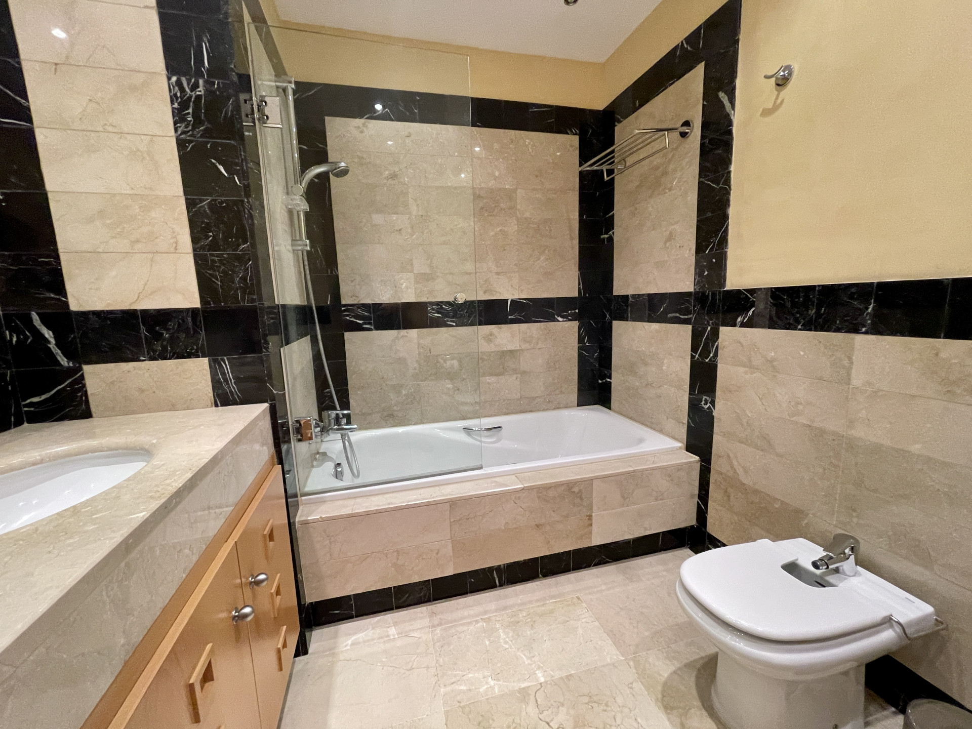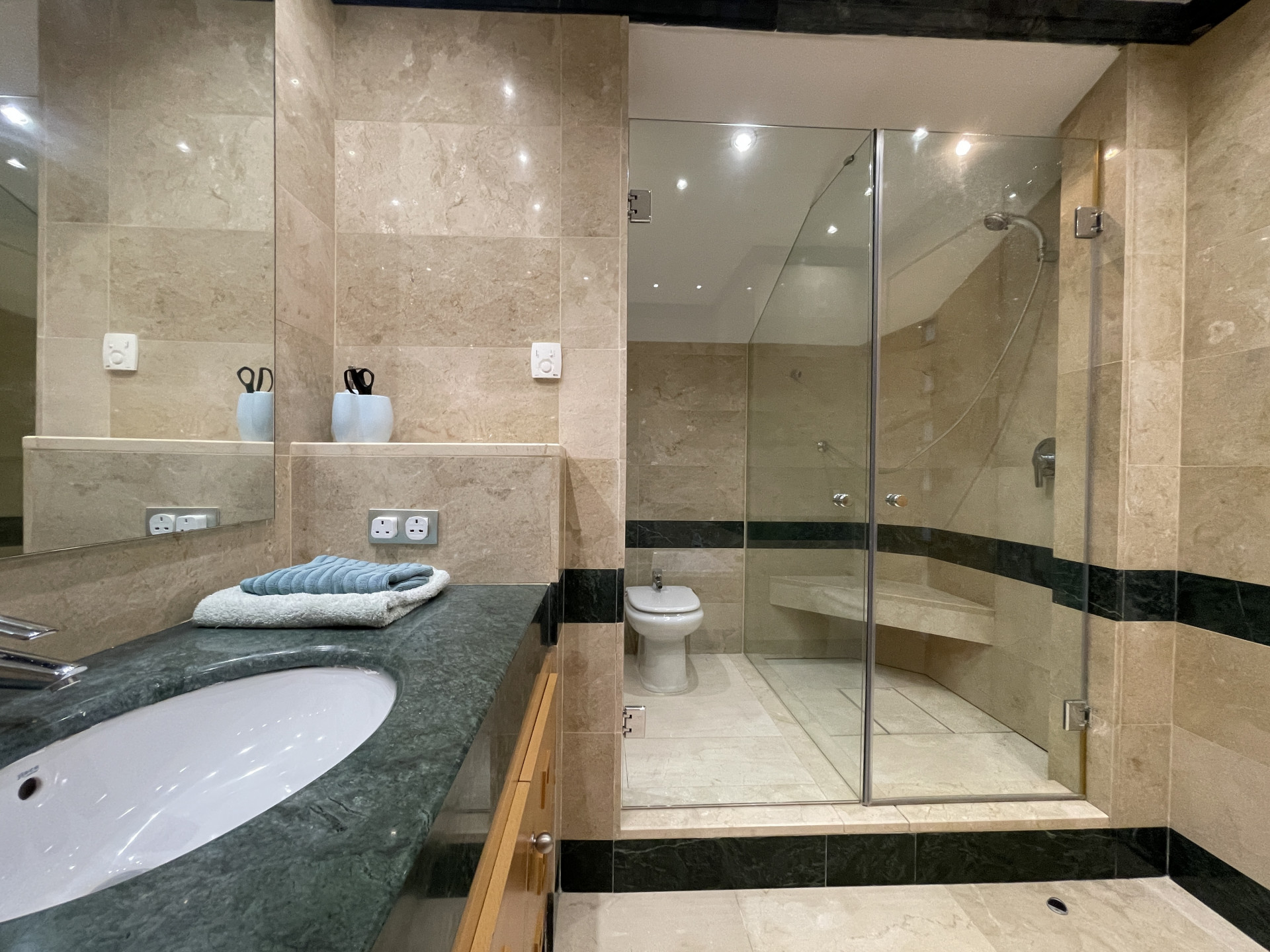 La propiedad incluye suelos de mármol crema en toda la vivienda, persianas eléctricas en el salón y dos de los dormitorios, bañera de hidromasaje y calefacción por suelo radiante en el baño principal, y aire acondicionado frío/calor.