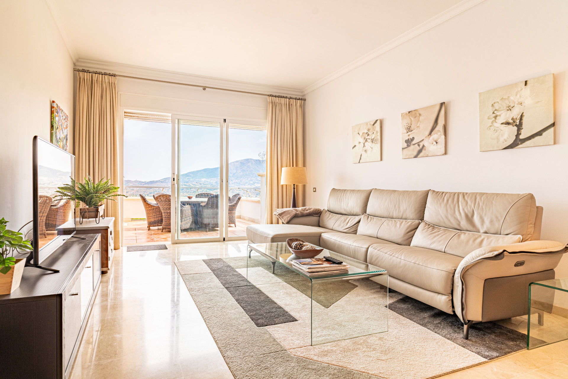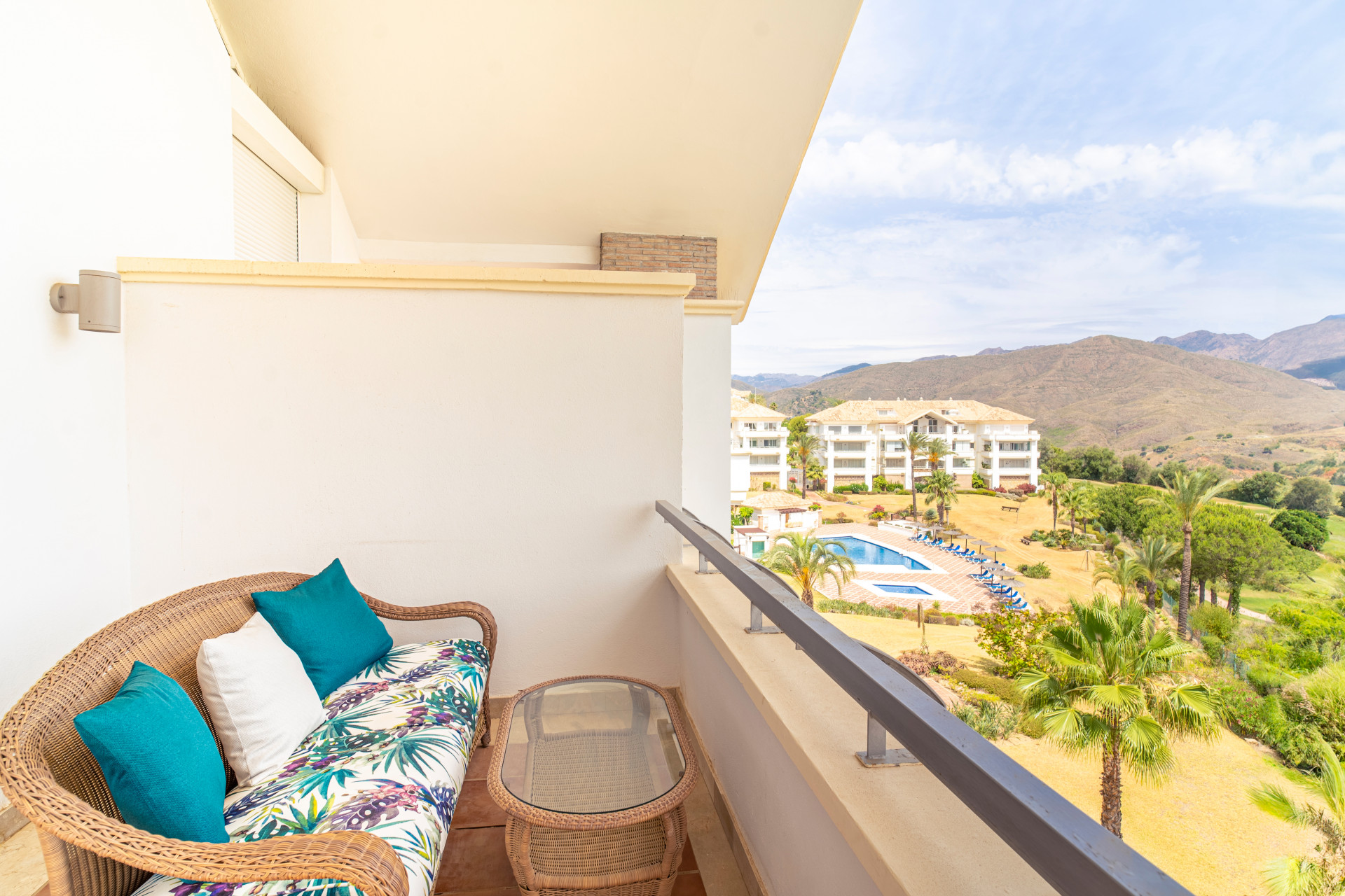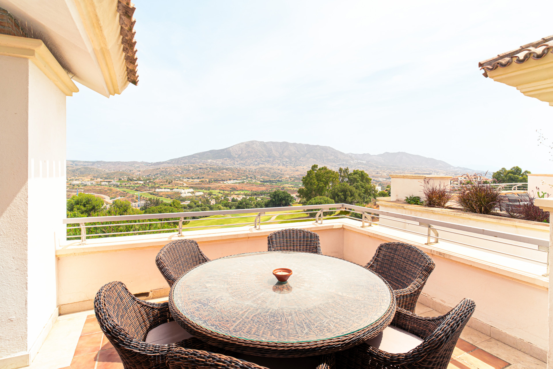 Ubicado en la exclusiva zona de La Cala Golf, este elegante ático ofrece vistas panorámicas, desde las calles del campo de golf hasta las montañas, el mar y las luces centelleantes en la distancia.